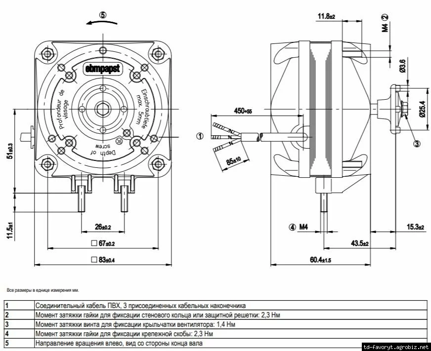Монтирование осевого рабочего колеса (крыльчатки) на вал двигателя через пластмассовую скобу соединяется болтом и винтом M4 (M5 с M4Q045-DA);