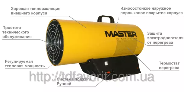 При работе тепловой пушки, помещение, в котором она находится должно проветриваться. Внешний корпус газовой пушки Master BLP 73E влагоустойчив, к тому же такой корпус имеет качественную теплоизоляцию и практически не нагревается снаружи. Внутри корпуса встроен мощный тепловентилятор, благодаря которому нагретый воздух быстро распространяется по всему объёму помещения.
