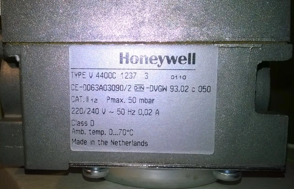 Газовый клапан Honeywell V4400C 1237. Pmax 50 mbar. Напряжение 220/240V Частота 50 Hz. 0,02 A. Подключение 3/4".