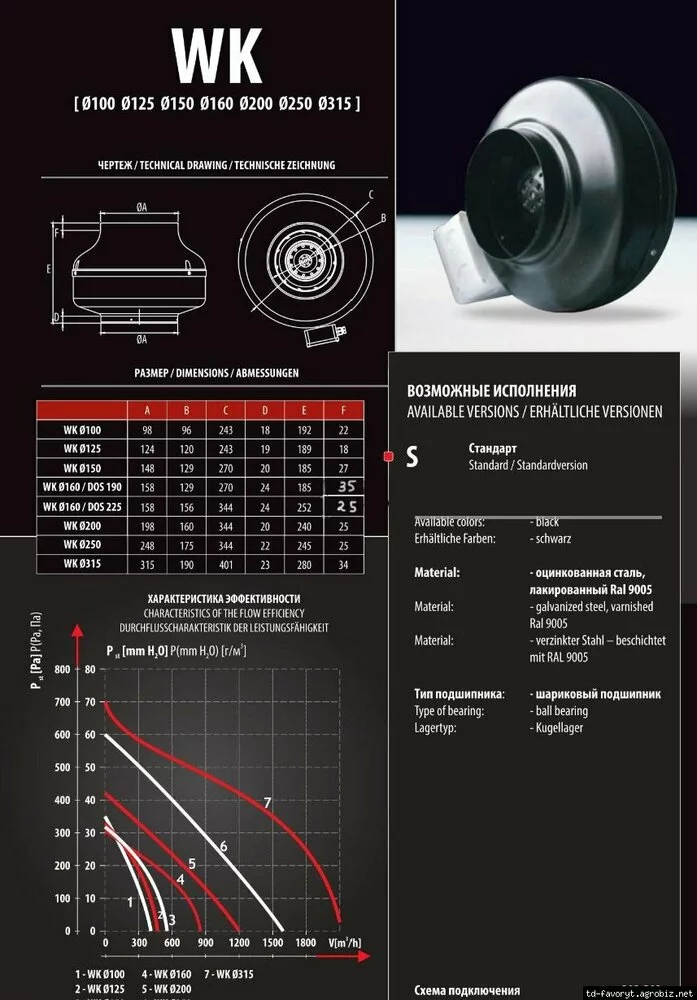 Вентилятор Dospel WK 315 (Польша) оборудован двигателем на шариковых подшипниках (может быть монтирован в любом положении) и внешним ротором. Лопасти турбины направленны назад, что обеспечивает более высокое давление и эффективность работы. Корпус выполнен из оцинкованной стали. В комплект вентилятора входит крепление для монтажа.