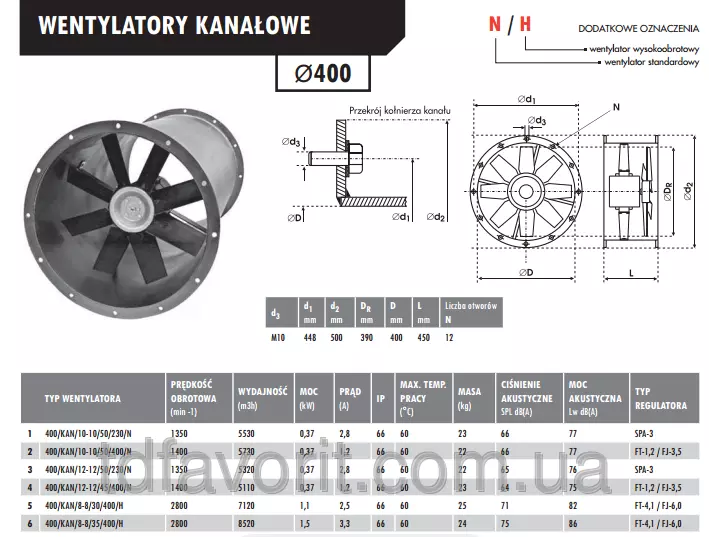 Стандартные осевые канальные вентиляторы Deltafan 400/KAN/8/8/35/400/H предназначены для монтажа в канале в любой позиции. Корпуса канальных вентиляторов изготовлены из высококачественной листовой стали, окрашенной порошком (Размеры круглых фланцев соответствуют норме PN-ISO 13351).Рабочие колёса вентиляторов изготовлены из литьевого полипропилена (PPG), усиленного стекловолокном (лопасти) и литьевым алюминием (втулка рабочего колеса). При более высоких требованиях, касающихся места работы, применяются лопасти, изготовленные из полиамида (PAG), усиленного стекловолокном или алюминием (более высокая термостойкость и прочность). Двигатели вентиляторов асинхронные, однофазные 230В/50Гц или трёхфазные 400В/230В/50Гц. Однофазные двигатели приспособлены к регулированию напряжением скорости вращения, а трёхфазные – к регулированию с помощью преобразователя частоты (инвертора) и в стандартной версии термозащиты. Степень защиты двигателей ? IP 66, изоляция класса нагревостойкости F. Максимальная температура работы для стандартных вентиляторов 60oC.