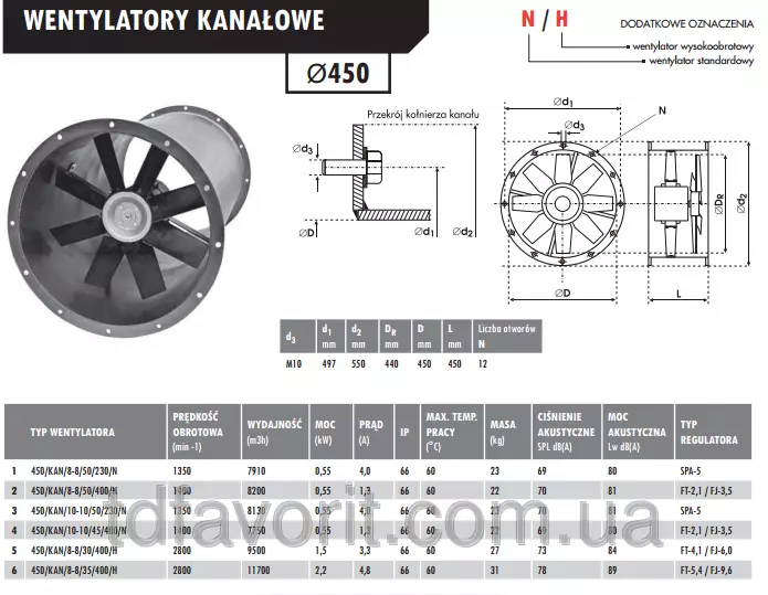 Стандартные осевые канальные вентиляторы Deltafan 450/KAN/10/10/50/230/N предназначены для монтажа в канале в любой позиции. Корпуса канальных вентиляторов изготовлены из высококачественной листовой стали, окрашенной порошком (Размеры круглых фланцев соответствуют норме PN-ISO 13351). Рабочие колёса вентиляторов изготовлены из литьевого полипропилена (PPG), усиленного стекловолокном (лопасти) и литьевым алюминием (втулка рабочего колеса).При более высоких требованиях, касающихся места работы, применяются лопасти, изготовленные из полиамида (PAG), усиленного стекловолокном или алюминием (более высокая термостойкость и прочность). Двигатели вентиляторов асинхронные, однофазные 230В/50Гц или трёхфазные 400В/230В/50Гц. Однофазные двигатели приспособлены к регулированию напряжением скорости вращения, а трёхфазные – к регулированию с помощью преобразователя частоты (инвертора) и в стандартной версии термозащиты. Степень защиты двигателей ? IP 66, изоляция класса нагревостойкости F. Максимальная температура работы для стандартных вентиляторов 60oC.