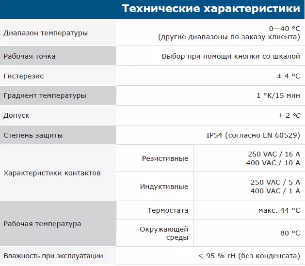 Промышленный термостат используется в сельском хозяйстве и промышленности (склады, теплицы, конюшни и т. д.). Для включения или отключения вентиляторов, электрических нагревателей и регуляторов по параметрам температуры. Этот термостат имеет газонаполненную трубку, которая гарантирует точную и надежную настройку температуры в диапазоне от 0 до 40 ° C. Механический термостат имеет релейный выход: 1 контакт C / O: 16 A (250 VAC) / 10 A (400 VAC).
