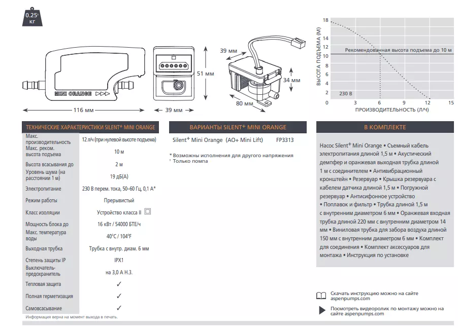 Компактный насос MINI ORANGE SILENT+ оснащен доп. секцией для снижения уровня шума отлично подходит для кондиционеров небольшого и среднего размера.Надежный, эффективный и бесшумный, этот насос будет работать совершенно незаметно - идеальное решение и для клиентов, и для установщиков.