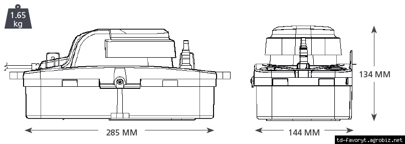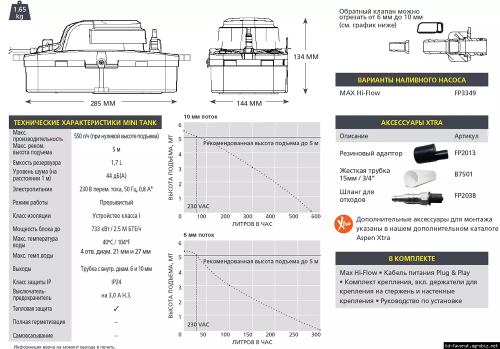 Питание 230 В АС, 75 Вт, макс. производительность до 550 л/час (при отсутствии подъема, см. диаграмму), макс. подъем до 5 м, размер насоса 144х285х134 мм.
