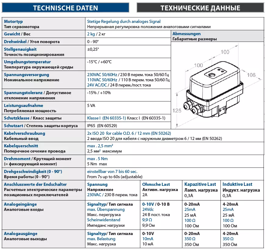 | Управляющий сигнал | 0-10В / 0-20мА / 4-20мА / 2-х поз. / 3-х поз. (настройка DIP-переключателями) |