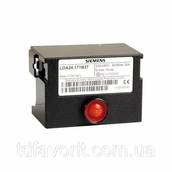 Блок управления горелки Siemens LOA24.171B27Landis & Gyr Siemens LOA 24.171 B27 - контроллер горелки, который разработан для управления одноступенчатыми и двухступенчатыми жидкотопливными горелками малой производительности (сжигание топлива до 30 кг/ч). При использовании топочного автомата LOA24.171B27 контроль пламени происходит за счет совместной работы с фотодатчиком пламени серии QRB или датчиком окислительного пламени QRC.