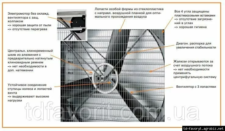 Направляющие воздушные планки каждой лопасти обеспечивают максимальное прохождение воздуха при минимальном сопротивлении и низкой расходуемой мощности. Жалюзи открываются воздушным потоком и удерживаются в открытом состоянии за счет специальной конструкции. При неработающих вентиляторах жалюзи автоматически закрываются и запираются магнитным устройством. Клиноременный шкив изготовлен из алюминия и отливается под давлением вкупе со ступицей.