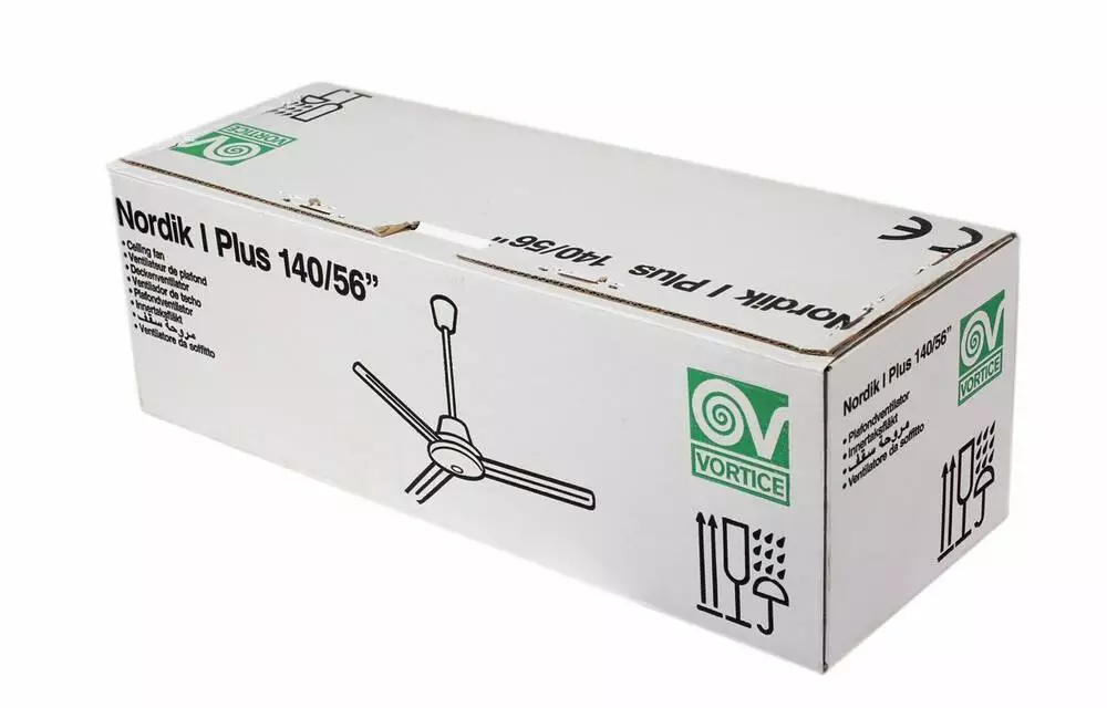 Діаметр лопатей вентилятора Vortice Nordik Inter Plus 140/56 становить 140 сантиметрів. Лопаті виготовлені з листової сталі та можуть бути білого, чорного або сірого кольору. Монтаж вентилятора Vortice Nordik Inter Plus 140/56 здійснюється на стелі та за допомогою спеціального гака. Стельовий вентилятор Vortice Nordik Inter Plus 140/56 постачається з дротовим вимикачем.
